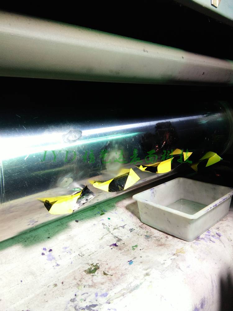 總的來說,鍍鉻滾筒是各種類型印刷滾筒中最精密、也是**的一類滾筒。因鍍鉻層具有良好的耐腐蝕性,很少出現(xiàn)兩端腐蝕,壓傷是其主要損壞方式。鍍鉻滾筒的修復(fù)工藝與鑄鋼、鑄鐵滾筒的修復(fù)工藝沒有明顯的不同,主要的差異僅在于鍍前活化的方法不同。 鍍鉻滾筒上之所以看不到銹蝕產(chǎn)物,是因?yàn)樵阱冦t面上會(huì)自發(fā)形成一層防腐能力極強(qiáng)的氧化膜,而且氧化膜的再生能力很強(qiáng),很難用常規(guī)的化學(xué)或電化學(xué)腐蝕方法將其除凈。目前人們無法在鍍鉻面上電刷鍍出結(jié)合力良好的金屬鍍層,其根本原因就是在鍍前處理過程中,沒能除掉鍍鉻面上的氧化膜并防止其再生。因此,能否徹底去掉鍍鉻面上的氧化膜并防止其再生,是決定鍍鉻滾筒電刷鍍修復(fù)成敗的關(guān)鍵。 精藝達(dá)JYD系列鉻面刷鍍技術(shù),能從根本上解決鍍鉻工件刷鍍結(jié)合力差的難題,而且修復(fù)后的鍍鉻滾筒具有更長的使用壽命。鍍鉻滾筒的基本修復(fù)工藝及主要說明如下: 機(jī)械打磨 → 電凈 → 水洗 → 活化(JYD系列鉻面專用活化方法)→ 鉻面底鎳(JYD系列專用鉻面底鎳)→ 水洗 → 鍍快速厚銅(厚銅及超硬厚銅合金等)→ 水洗 → 打磨 → 鍍3號快速鎳 →修磨 → 拋光 → 檢驗(yàn) 經(jīng)鉻面活化處理后,不必水洗,可以直接鍍鉻面底鎳以提高鍍層的結(jié)合強(qiáng)度。后續(xù)刷鍍工藝與其它滾筒修復(fù)的工藝流程基本相同。 僅從使用性能上講,選用JYD系列的3號快鎳作為面層就可以滿足印刷機(jī)滾筒的使用要求。如果用戶特別要求刷鍍的面層與鍍鉻層有相近的硬度,可選用JYD系列的自補(bǔ)償鎳基合金作面層,該鍍層有很高的的硬度和耐磨性。 有些用戶希望修復(fù)部位與原鍍鉻層有相近的顏色,要求用電刷鍍鉻層進(jìn)行罩面。實(shí)際上,這種要求值得商榷。因?yàn)?,到目前為止,電刷鍍鉻仍存在三大問題:1)目前可用的鉻鍍液都含有Cr6+,毒性大;2)鍍層沉積速度慢、脆性大、結(jié)合力差;3)即使是刷鍍一層薄薄鉻層,刷鍍鉻層和未修復(fù)部位的鉻層仍存在色差。因此,如果不是特別強(qiáng)調(diào)修復(fù)后要刷鍍滾筒外觀的一致性(舊件翻新),重點(diǎn)考慮修復(fù)后的使用效果,沒有必要鍍鉻。